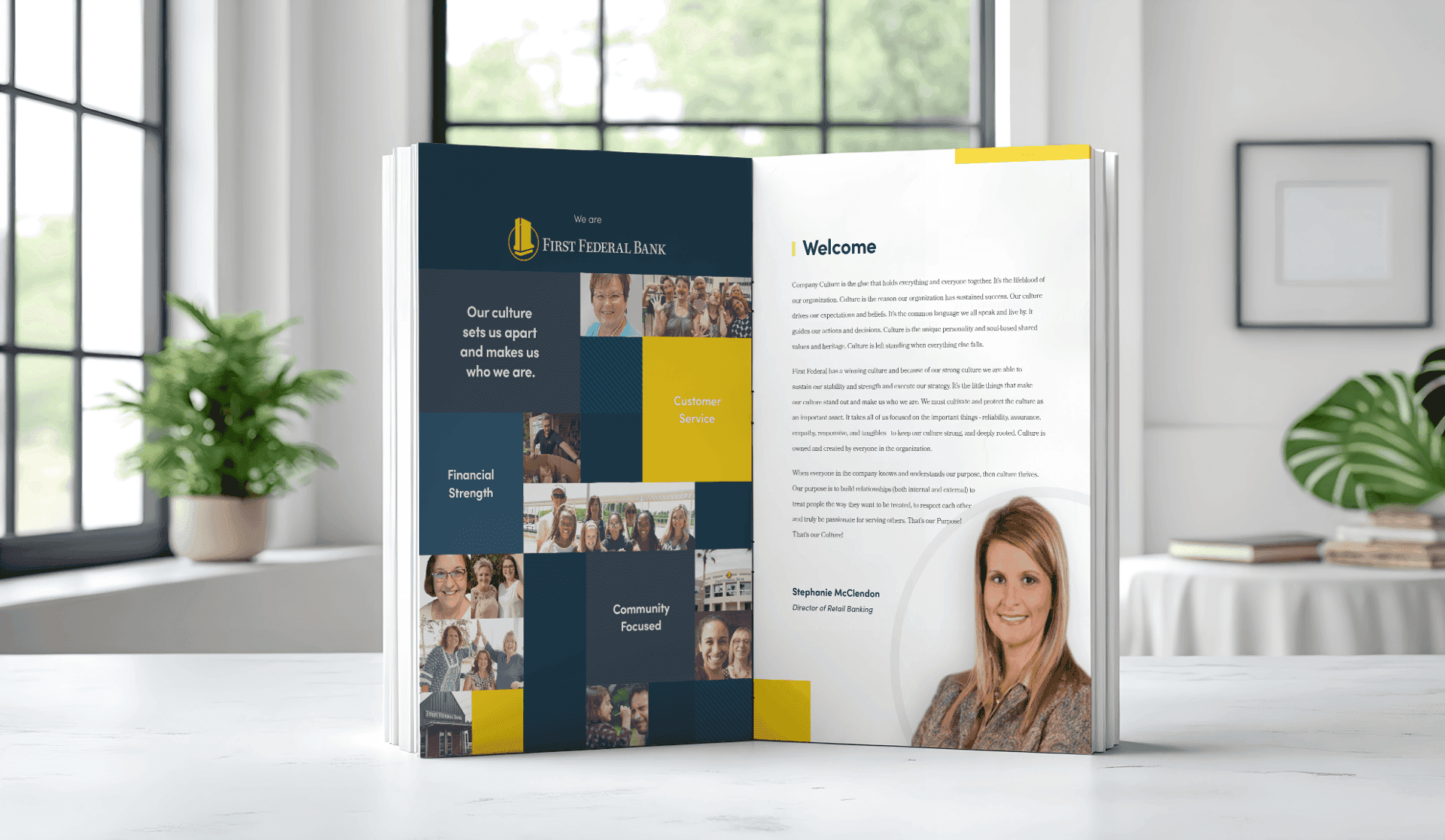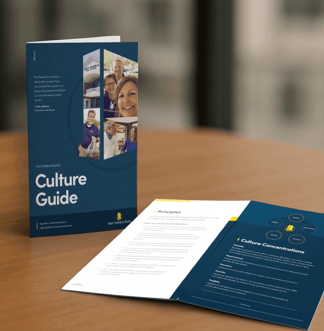 Alongside the brochures, a culture guide was developed to give the organization a shared internal language, because how a bank talks to its own people shapes how those people represent the brand externally. The guide gave leadership a consistent reference point and gave staff something more tangible than abstract values — a clearer sense of what the brand actually stands for, how it shows up, and what it expects from the people representing it.