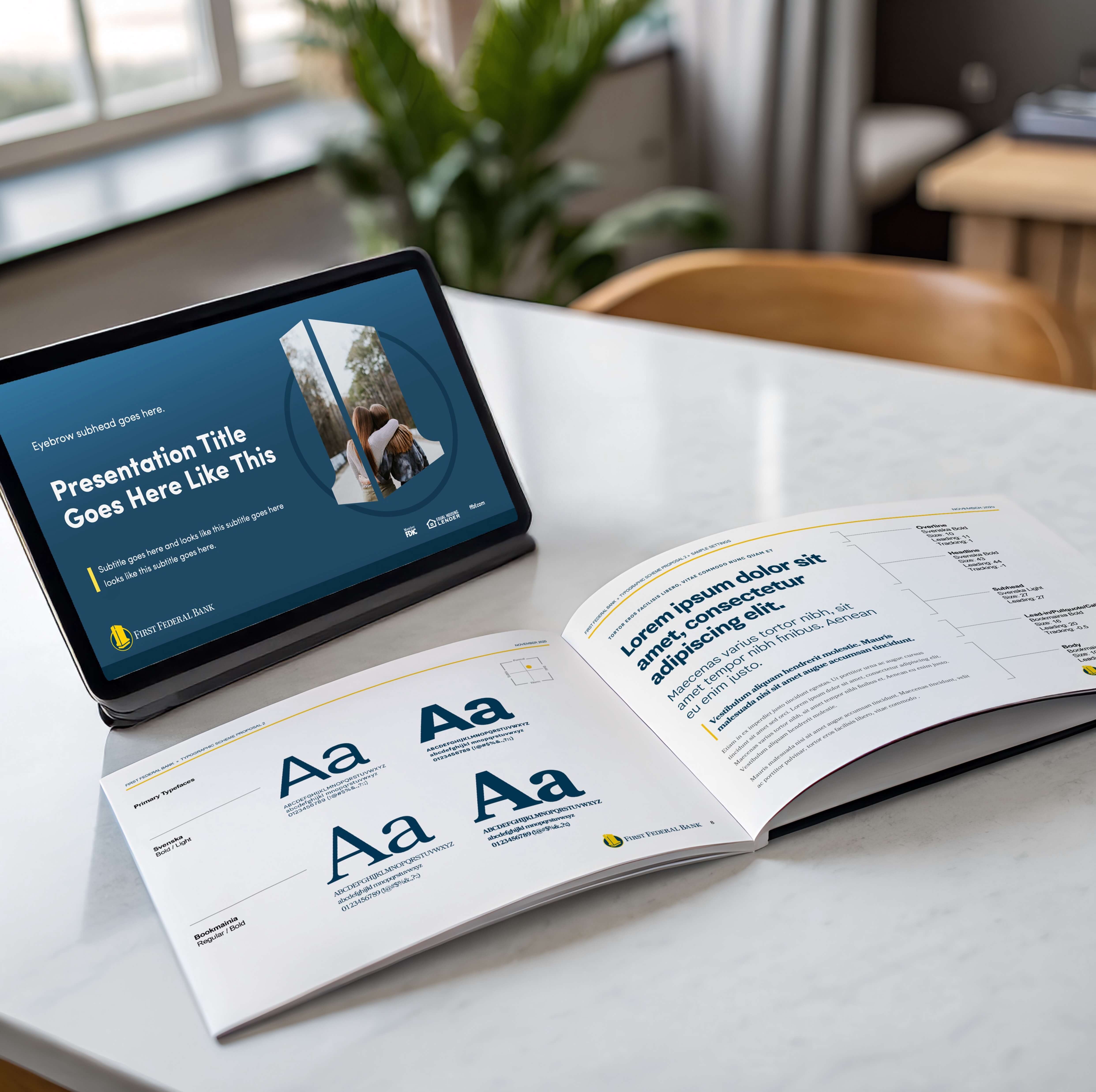 The foundation of the work was bringing the bank’s visual language into a coherent, consistent state across every surface it touched. That meant building a design system that could hold up in real-world use — from branch-level print materials to executive presentations — and still feel like it came from the same place every time.